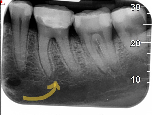 בתמונה אחרי 10 שנים, ניתן לראות הסתיידות כמעט מלאה של תעלות השורש. ברגע שהוסר הגורם המזהם , בוצע כיפוי מוך (תחת תנאים מסוימים, כפי שמצוין במחקרים עדכניים), הונחה משחה המעודדת יצירת דנטין שלישוני. תאי מוך השן הצליחו לאטום את השורש באופן טבעי מבפנים, בלי התערבות שלנו ועם גיוס מירבי של מערכת החיסון.